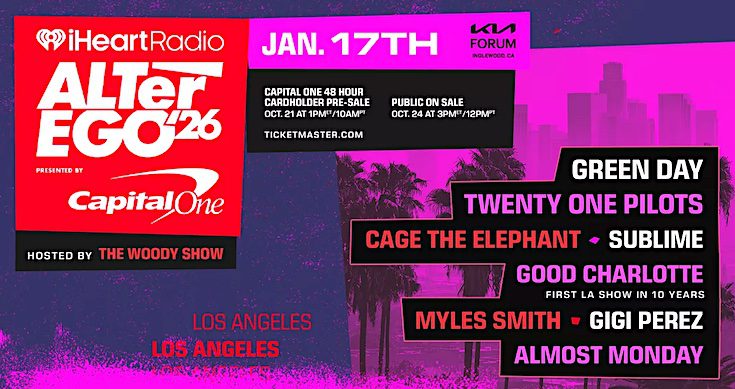 “This year’s iHeartRadio ALTer EGO brings together a powerhouse lineup that reflects the full diversity of Alternative and Rock, with absolute legends like Green Day and Twenty One Pilots mixed in with breakout artists like Myles Smith, Gigi Perez, and Almost Monday,” said Lisa Worden, PD of ALT 98.7 and iHeartMedia SVP of Rock & Alternative. “We are honored to have such a brilliant collection of artists on the show this year. Sublime has had the No. 1 song at Alternative radio for the past four weeks, eclipsing their previous No. 1 singles, Good Charlotte will play their first show in Los Angeles in over 10 years, and Cage the Elephant is fresh off a U.S. tour with Oasis. All of these artists are ready to bring it! We cannot wait.”