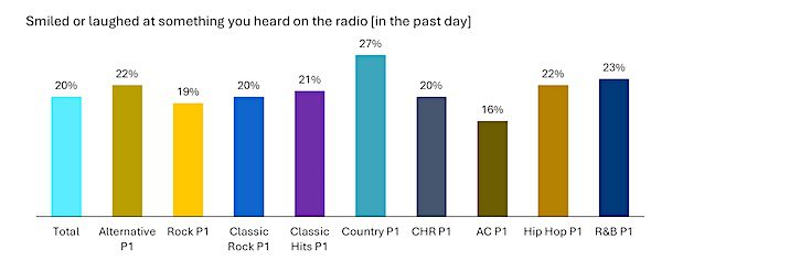 Even when we set the bar no higher than “smiled or laughed at something you heard on the radio,” only 20% of the sample in NuVoodoo Ratings Prospects Study 26 said that had happened “in the past day.” Country P1s were the most likely to recall a laugh or smile in the past day — and it’s only 27% there, as shown in the chart above.