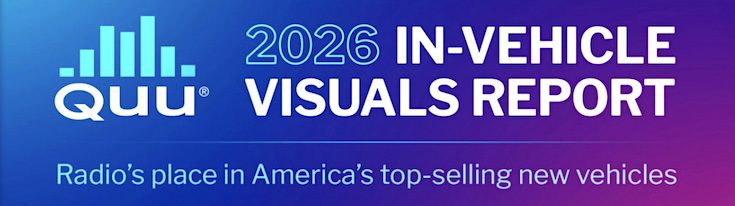 • Quu Inc., the trusted industry leader providing easy deployment of visual content for radio, has released its 2026 In-Vehicle Visuals Report. Now in its third year, the report offers an updated view of radio’s place in the top 100 best-selling vehicles in the U.S. and includes a database with: A) vehicle data; B) Expanded vehicle analysis; C) Updated scorecard of dashboard features; D) Six key findings with actionable recommendations.