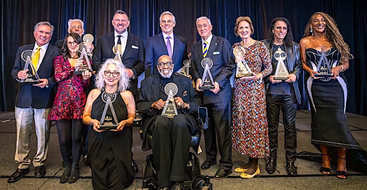 Afterward, the 2025 inductees gathered for their traditional class photo. Pictured, standing, (l-r): Bob Lacey (Bob & Sheri), Martha Quinn, Mike McVay, Tom Carballo (Mojo in the Morning), Colin Cowherd, Scott Simon, Julie Talbott, Alice Cooper, and DeDe McGuire. Front row, (l-r): Sheri Lynch (Bob & Sheri), and Shelley “The Playboy” Stewart. [Photo credit: David T. Kindler]